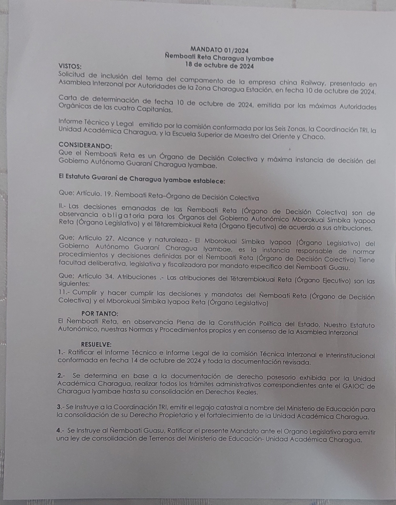 4.- Se Instruye al 脩embot扫 Guasu, Ratificar el presente Mandato ante el 脫rgano Legislativo para emitir una ley de consolidaci贸n de Terrenos del Ministerio de Educaci贸n- Unidad Acad茅mica Charagua.