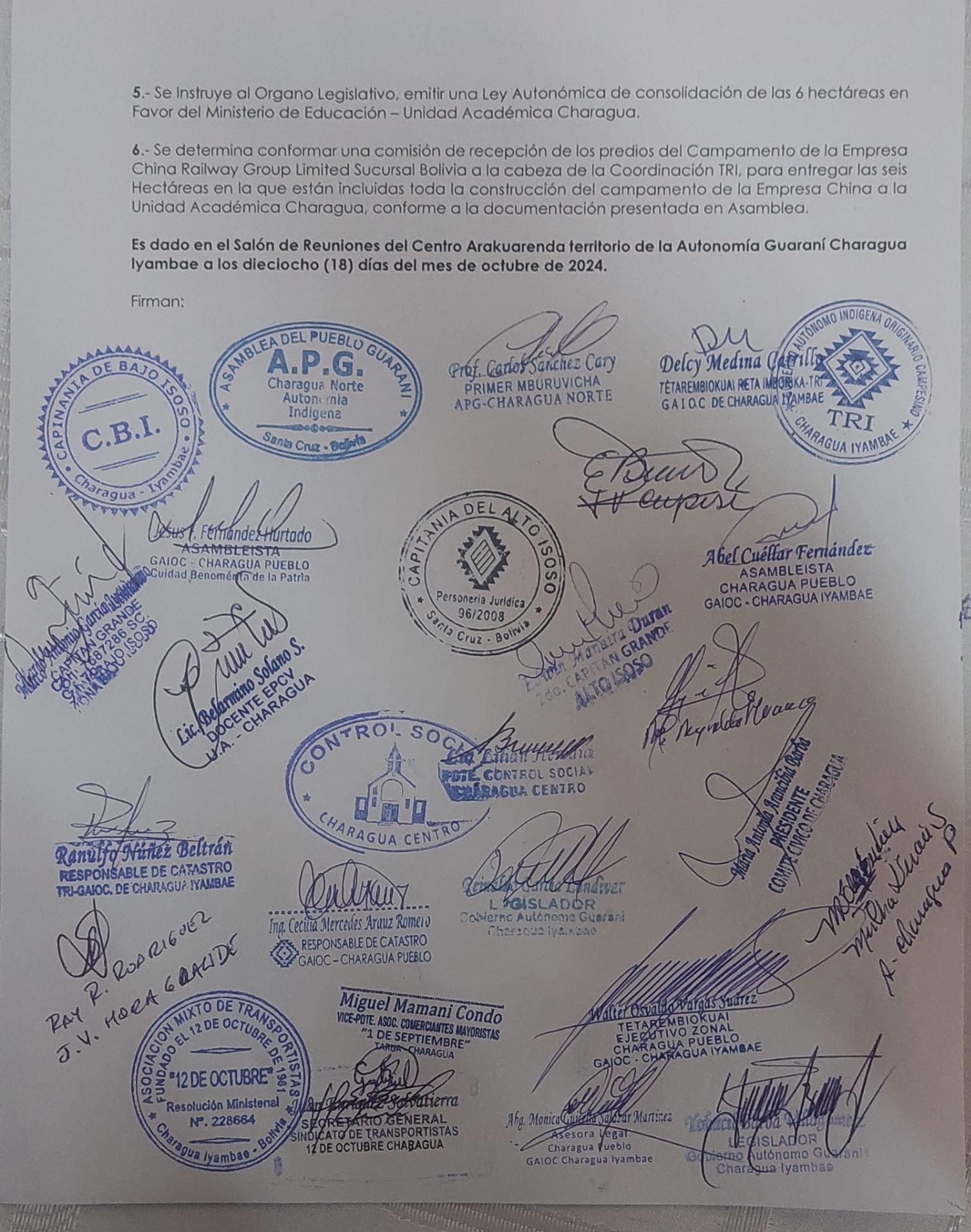 Es dado en el Sal贸n de Reuniones del Centro Arakuaarenda territorio de la Autonom铆a Guaran铆 Charagua Iyambae a los dieciocho (18) d铆as del mes de octubre de 2024
